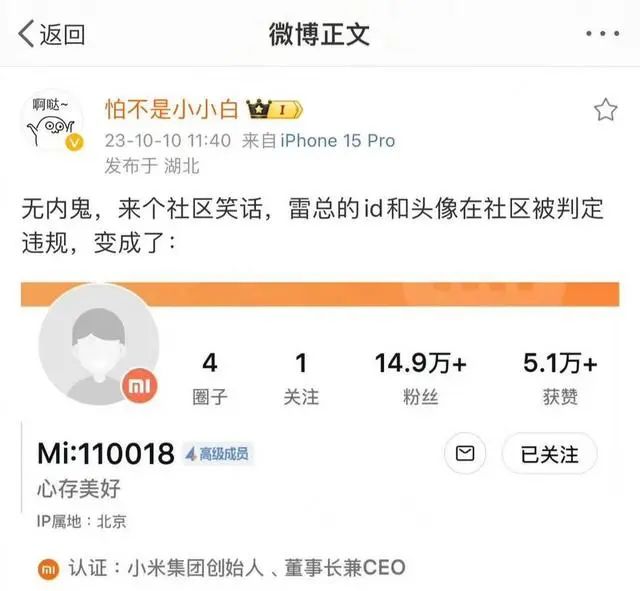 其他消息方面,10月11日,网友@怕不是小小白晒出图片称,小米CEO雷军的账号被小米社区判定违规,其头像、名称被清除。