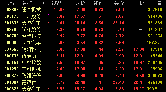 汽车产业链股今日再度走强,截至收盘,隆基机械、圣龙股份、长城汽车、光洋股份、模塑科技(维权)、众泰汽车等涨停,明阳科技涨超9%。