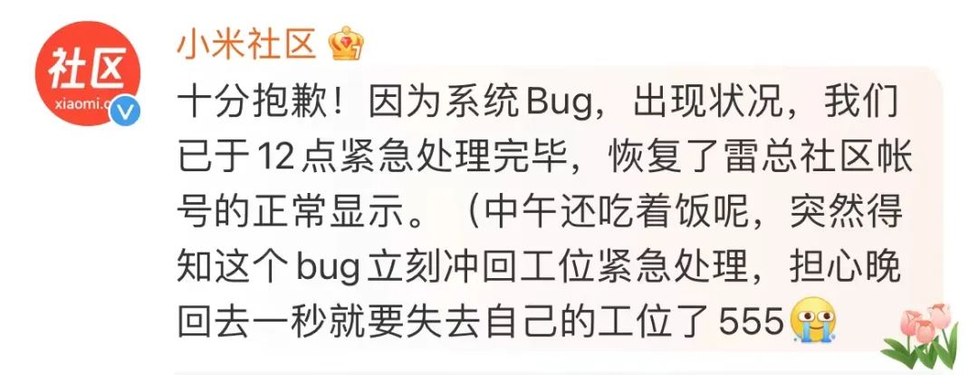小米社区官方微博也就此回应:十分抱歉!因为系统Bug,出现状况,我们已于12点紧急处理完毕,恢复了雷总社区帐号的正常显示。(中午还吃着饭呢,突然得知这个bug立刻冲回工位紧急处理,担心晚回去一秒就要失去自己的工位了。