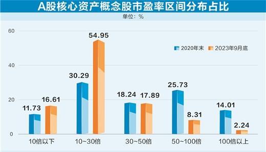 概念股更是大幅回撤,以今年9月底收盘价与2021年以来高点相比,多达102只概念股回撤超50%,还有120只个股回撤幅度在30%至50%。这222只个股占到核心资产成分股总数的近三分之二。