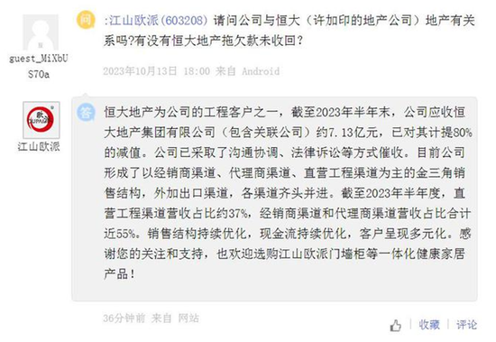 今日上午,江山欧派在互动平台回复投资者提问称,恒大地产为公司的工程客户之一,截至2023年半年末,公司应收恒大地产集团有限公司(包含关联公司)约7.13亿元,已对其计提80%的减值。