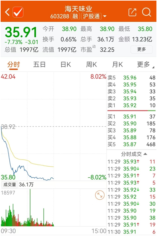 今日早盘,调味品龙头海天味业股价遭遇“闪崩”,盘中最大跌幅超8%,并创下近4年半新低。截至午间休市,海天味业股价报35.91元,半日下跌7.73%,今年以来累计跌幅达45%。