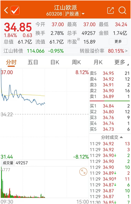 江山欧派是集研发、生产、销售、服务于一体的专业制门企业。按照上述内容计算,江山欧派此次关于恒大地产应收账款的计提金额达到5.7亿元。或受此影响,江山欧派股价早盘“高台跳水”,从开盘涨超8%回落至午盘涨幅不到2%。