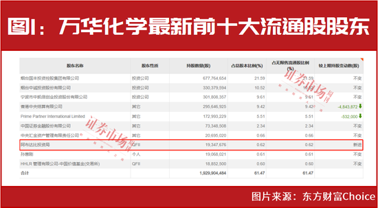 公告显示,截至今年三季度末,阿布达比投资局新进现身在万华化学的前十大流通股股东名单,并且以1934.77万股的持仓数量,约17亿元的持股市值一跃成为公司的第八大流通股股东(见图1)。