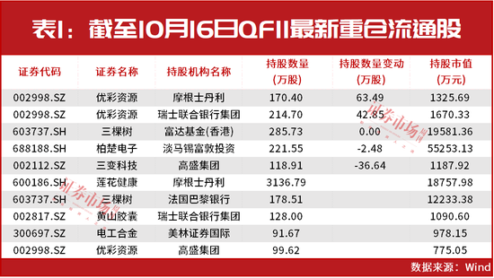 如截至目前,在优彩资源、三棵树和柏楚电子等多家公司的前十大流通股股东中也出现了QFII的身影,其中摩根士丹利和瑞士联合银行集团在今年三季度期间均对优彩资源进行了不同程度的增持,摩根士丹利、法国巴黎银行和瑞士联合银行集团等则分别新进现身莲花健康、三棵树和黄山胶囊的前十大流通股股东名单(见表1)。