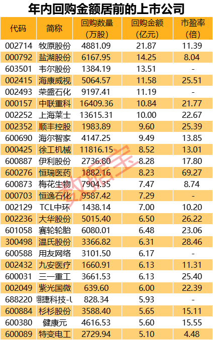 证券时报·数据宝统计,今年以来已有1092家上市公司实施回购,占全部A股的二成左右,合计实施回购金额达到611.78亿元。135家上市公司回购金额在1亿元以上,其中牧原股份、盐湖股份、韦尔股份、海康威视、荣盛石化、中联重科6家上市公司回购金额超过10亿元。