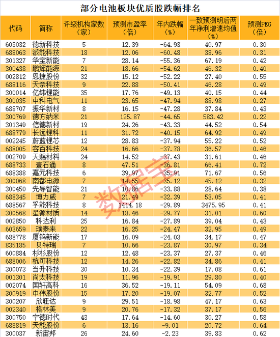 其中,有21家机构评级的德方纳米,预测市盈率为125倍多,明后两年净利增速预期均值达到583%,预测PEG为0.21倍榜单最低。此外,中科电气、德新科技、派能科技、南都电源、贝特瑞等个股预测PEG均低于0.4倍。