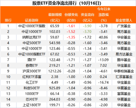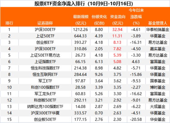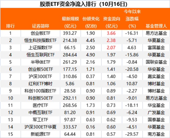10月16日下午,A股全天行情震荡走弱,上证指数收跌0.46%,深证成指收跌1.42%,创业板指收跌2.00%。市场下跌中,ETF资金“越跌越买”。