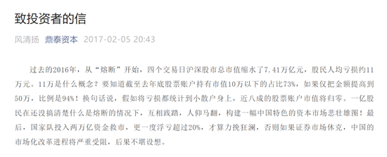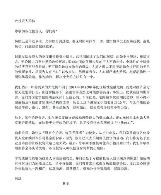 10月17日,网传“鼎泰投资”致投资人的一封信:股市已失去长期价值投资的基础,我们作为基于企业基本面的长线投资策略已经失效。郑重建议各位投资人全部赎回本公司基金的份额。