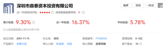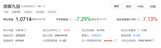 有业绩显示的“鼎泰九剑”由林波峰担任,成立来收益(1.5年)7.13%,今年来收益-7.29%,排名7936/10678,比较靠后,规模估计也相当迷你。