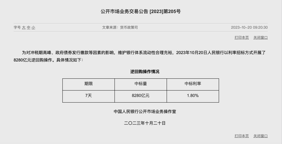 10月20日,为对冲税期高峰、政府债券发行缴款等因素的影响,维护银行体系流动性合理充裕,央行公开市场开展8280亿元7天期逆回购操作,中标利率1.80%,与此前持平。因今日有950亿元7天期逆回购到期,实现净投放7330亿元。