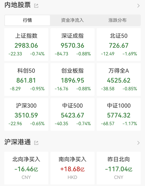 今日,大盘延续调整,午后加速下行,沪指跌破3000点整数关口,深成指、创业板指午后一度跌超1%,均创出3年多以来新低。截至收盘,上证指数报2983.06点,下跌0.74%;深证成指报9570.36点,下跌0.88%;创业板指报1896.95点,下跌0.88%。
