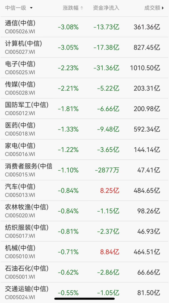 板块方面,中信一级行业中,大部分行业下跌、小部分行业上涨;其中,房地产、电力设备及新能源、综合涨幅靠前,分别上涨0.59%、0.40%、0.32%;通信、计算机、电子跌幅靠前,分别下跌3.08%、3.05%、2.23%。