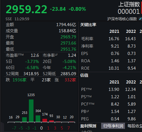 A股低开低走,三大指数盘中均跌逾1%,刷新阶段新低。截至午间收盘,上证指数午盘跌0.8%报2959.22点,深证成指跌0.81%报9492.76点,创业板指跌1.04%报1877.14点,科创50指数跌1.65%报847.56点,两市成交额为4418.3亿元。