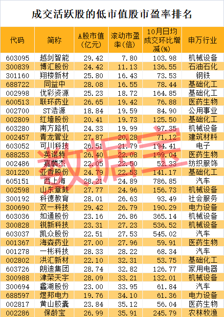 数据宝统计,最新A股市值低于30亿元,且10月以来日均成交环比增长50%以上的股票有155只。
