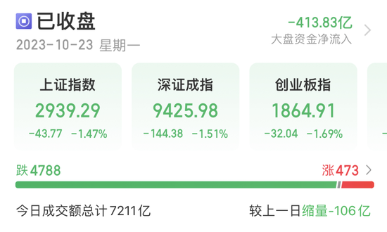 10月23日,A股再现低迷走势,上证指数收盘下跌1.47%,报收2939.29点。创业板指、沪深300指数分别下跌1.69%、1.04%,最新指数创三年来新低。全天A股成交7217亿元,单日成交额为10月以来新低。