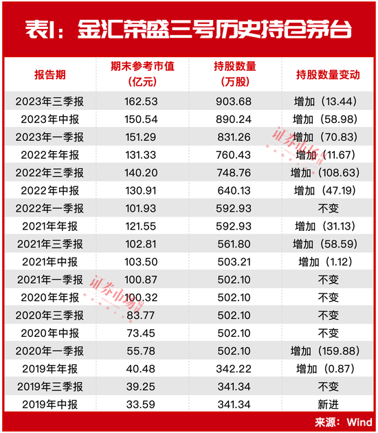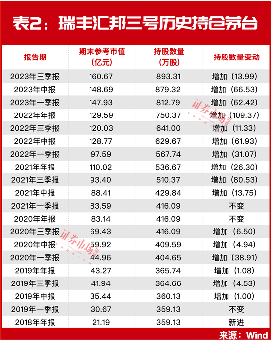 近年以来,通过重仓投资白酒龙头贵州茅台并赚取不菲收益,两只“三号基金”被市场密集关注,它们分别为深圳市金汇荣盛财富管理有限公司—金汇荣盛三号私募基金、珠海市瑞丰汇邦资产管理有限公司——瑞丰汇邦三号私募基金,随着贵州茅台最新披露三季报,“三号基金”的最新持仓动态再度浮现。10月20日晚,贵州茅台发布三季报显示,前三季度净利润528.76亿元,同比增长19.09%。据其同步披露三季度股东最新持仓显示,两只“三号基金”给与了进一步加仓。具体来看,金汇荣盛三号增仓13.44万股至903.68万股;瑞丰汇邦三号增持13.99万股至893.31万股。拉长周期来看,两只“三号基金”对茅台均持续“买买买”,而且似乎只买不卖。数据显示,金汇荣盛三号曾于2019年中报新进成为贵州茅台前十大流通股股东,当时持仓341.34万股,持仓市值约为33.59亿元。截至2023年三季报,已连续现身持仓达18个季度。期间多为增仓或无变动式持股。瑞丰汇邦三号对于贵州茅台的调仓步调与金汇荣盛三号也如出一辙(见表1、表2)。