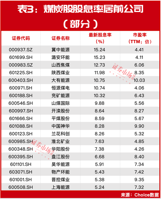 从个股来看,冀中能源(维权)、潞安环能、山西焦煤、陕西煤业、兖矿能源等股息率较高,均超过10%,中国神华股息率也超过了8%(见表3)。