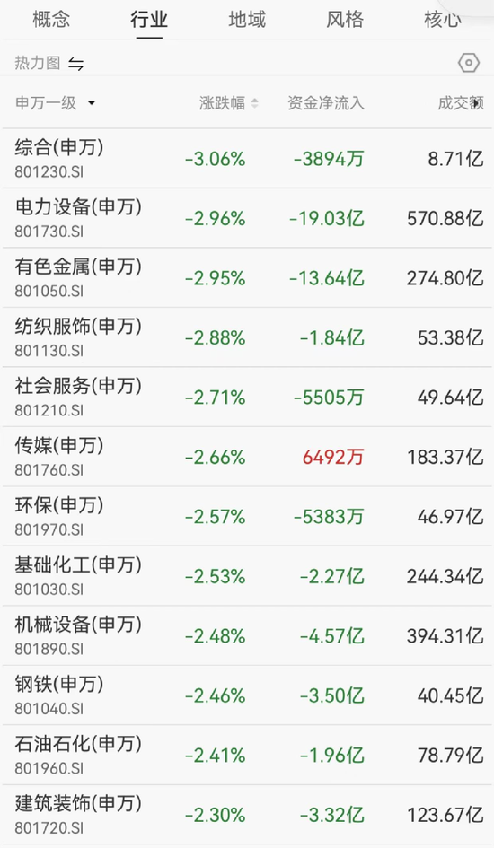 申万一级行业全部收跌,有色、电力设备、纺织服装、传媒、基础化工等行业跌幅居前;二级行业方面,与卫星互联网概念相关的航天装备行业、养殖业、乘用车、保险等行业逆势上涨。
