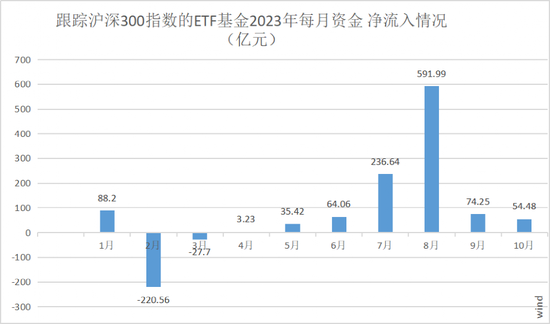 记者发现,跟踪沪深300指数的ETF基金持续获资金青睐。除了今年2月、3月有资金流出,其余各月均呈现明显资金净流入,尤其从近三月来看,7月、8月、9月沪深300指数相关ETF基金合计吸金分别为236.64亿元、591.99亿元、74.25亿元。