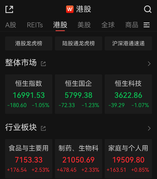 10月24日,恒生指数收跌1.05%失守17000点,报16991.53点,恒生科技指数跌1.07%,恒生国企指数跌1.23%。