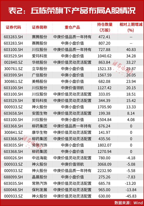 此外,中庚价值品质一年持有、中庚价值领航、中庚价值灵动灵活配置和中庚小盘价值联合加仓了川仪股份,中庚小盘价值和中庚价值灵动灵活配置联合加仓了爱玛科技……(见表2)。