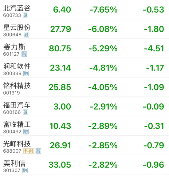 近期表现持续活跃的华为汽车概念股今日午后走弱,北汽蓝谷、浩物股份等多只热门股盘中一度触及跌停。截至收盘,欧菲光跌停,北汽蓝谷跌超7%,浩物股份跌超6%,赛力斯跌超5%。