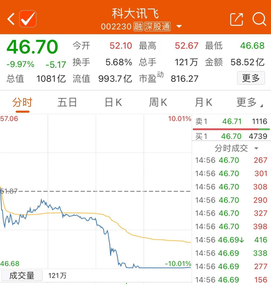 今日午后,科大讯飞突发跳水,股价接连走低触及跌停。截至收盘,科大讯飞报46.70元,大跌9.97%,全天成交金额58.52亿元,最新总市值1081亿元。