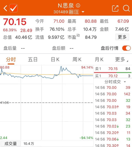 新股市场近期情绪有所回暖。N思泉今日登陆创业板,发行价41.66元/股,盘中一度大涨超90%。截至收盘,N思泉报70.15元,涨68.39%,全天换手率76.10%,成交额7.46亿元。按收盘价计算,N思泉的单签盈利超1.4万元。
