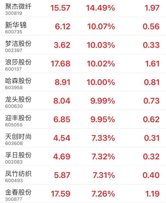 纺织服饰板块今日全天表现强势,聚杰微纤涨超10%,新华锦、梦洁股份、浪莎股份、哈森股份、龙头股份、迎丰股份等涨停。