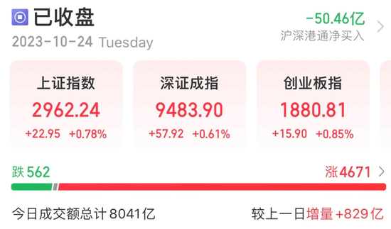 在汇金再次入市增持的利好刺激下,今日A股放量反弹,科创50指数盘中一度涨超2%,创业板指、中证500等指数盘中均涨超1%。截至收盘,上证指数报2962.24点,涨0.78%;深证成指报9483.90点,涨0.61%;创业板指报1880.82点,涨0.85%。沪深两市全天成交额8041亿元,较上个交易日放量829亿元。北向资金全天净卖出50.46亿元。
