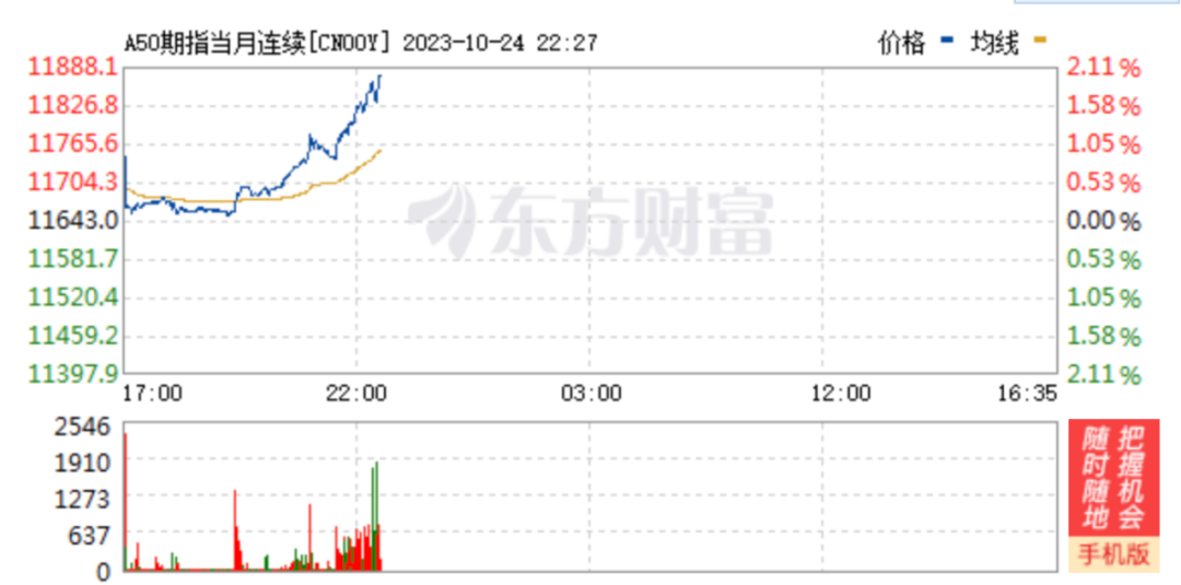 10月24日晚间,A50指数期货持续走高,截至发稿,涨近2%。