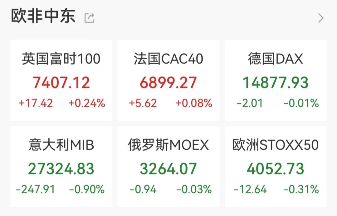 欧股方面,英国富时100指数和法国CAC40指数均上涨,分别涨0.24%、0.08%;德国DAX指数微跌0.01%;意大利MIB指数跌0.9%。