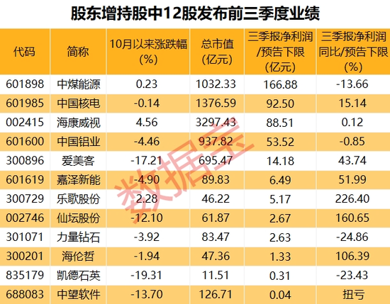 10月以来,发布增持计划的42股中,海伦哲(维权)、中国铝业、中国核电、乐歌股份、中国神华的股价表现相对亮眼,年内均累计上涨超20%。业绩方面,目前有12股已经发布了三季报或前三季度业绩预告,按照三季报和预告下限数据来看,12股全部盈利。