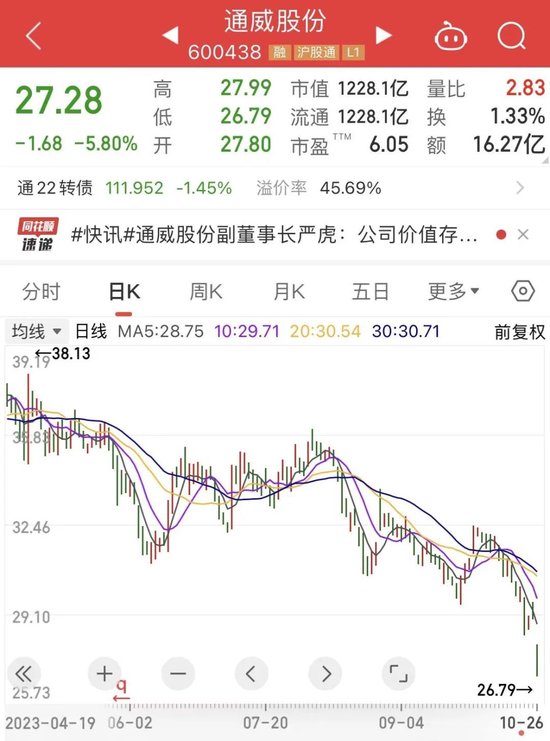 上半年公司净利还保持增长之势,三季度业绩突降明显使得股价承压。对于利润下滑,通威股份表示,主要系报告期内光伏产业链价格同比下行所致。
