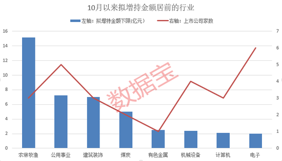 10月以来,农林牧渔、公用事业行业分别有3家和5家上市公司拟增持,拟增持下限金额分别为15.15亿元和7.25亿元,远超其他行业。