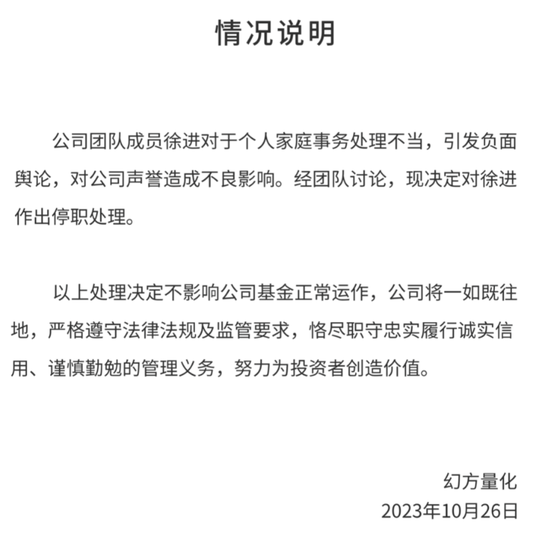 10月26日晚,幻方量化发布情况说明称,公司团队成员徐进对于个人家庭事务处理不当,引发负面舆论,对公司声誉造成不良影响。经团队讨论,现决定对徐进作出停职处理。以上处理决定不影响公司基金正常运作,公司将一如既往地,严格遵守法律法规及监管要求,恪尽职守忠实履行诚实信用、谨慎勤勉的管理义务,努力为投资者创造价值。