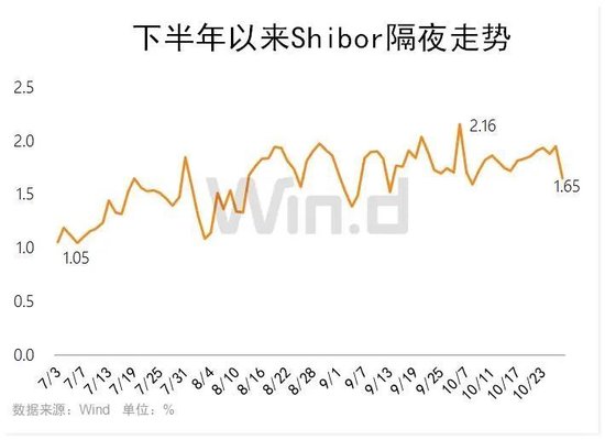 Wind数据显示,10月26日隔夜Shibor出现大幅下降,报1.65%,较上个交易日快速走低30.2bp,创近半个多月以来新低。