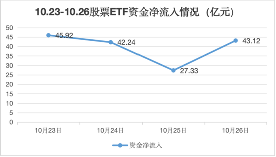 至此,本周以来资金已经连续四个交易日净流入股票型ETF,在底部区域借道ETF布局的意向浓厚。其中,有三个交易日净流入资金超40亿元。10月23日至10月26日合计四个交易日内,股票ETF累计净流入资金163.04亿元,扭转了本月前期净流出的局面。