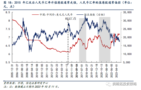 汇改后人民币升值通常有利于港股表现,人民币贬值阶段港股通常表现偏弱。2015年“811汇改”前,人民币长期升值,与港股表现相关性不强。汇改之后,汇率双向浮动弹性明显增强,人民币中间价形成的规则性、透明度和市场化水平显著提升。此后,人民币兑美元汇率与港股市场表现相关度提升。人民币升值阶段,一方面对港股上市公司的盈利预期有积极影响,另一方面人民币资产吸引力持续增强,恒生指数绝对收益通常走强。反之人民币贬值阶段,恒生指数绝对收益通常偏弱。但是人民币汇率对港股相对于A股的超额收益的影响并不十分明显。
