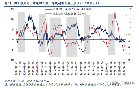 (2)历史上PPI当月同比增速回升期,通常处于经济回升的中后期,恒生指数超额收益相对更确定。包括2003年10月-2004年10月,2007年7月-2008年8月,2009年7月-2010年5月,2015年9月-2017年3月,恒生指数大部分情况下能取得幅度在10%-40%之间的超额收益。