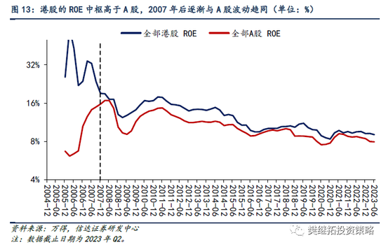 港股的ROE中枢高于A股,但长期来看港股ROE逐步下行,2007年之后波动与A股趋同。2005年至2023年Q2,全部港股ROE(TTM)中枢为13%,高于全部A股ROE(TTM)中枢10%。但长期来看,港股ROE水平逐步下行。2006-2007年港股盈利整体高位震荡,ROE(TTM)中枢为28.3%,而在2007年之后,随着中国石油、中国石化、工商银行、建设银行等大市值的能源、银行板块上市公司陆续纳入恒生指数,港股ROE波动逐渐与A股趋同,港股ROE水平也逐步下台阶。2020年Q4港股ROE(TTM)下滑到历史低位8.3%。2021-2023年Q2港股ROE水平在9%-10%之间波动。