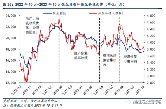 2022年10月至今,港股行情出现反复,主要与国内经济恢复波折较多有关。整体来看可以分为三段:(1)2022年10月底-2023年1月,恒生指数和恒生科技指数均反弹。这一阶段,国内房地产、防疫政策均有积极的变化,经济恢复预期提升。本轮港股反弹催化剂还包括港股互联网产业强监管的负面影响已经基本消化,中美审计监管合作取得新进展,海外流动性紧缩预期阶段性缓解等因素也有催化作用,港股出现了较为明显的反弹。(2)2023年2月-5月,恒生指数和恒生科技指数均下跌。这一阶段,中国经济疫后修复最快的阶段过去,经济复苏斜率放缓。中美关系反复也阶段性影响风险偏好。(3)2023年6-7月,恒生指数和恒生科技指数有所反弹,这一阶段,稳增长政策密集出台,经济企稳预期有所回升。中美关系出现稳定迹象,带动港股超跌反弹。(4)2023年8月-9月,国内经济修复力度偏弱,美元指数走强,恒生指数和恒生科技指数再次出现调整。