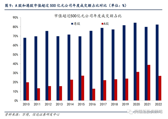 从成交额来看,港股市值大于500亿的公司成交额占到全部港股70%-80%以上,而A股市值大于500亿的公司成交额占比仅为20%-30%。港股流动性呈现向大市值公司集中的特征。2010年-2022年,港股大盘股(市值大于500亿的公司)成交额大多数情况下占全部港股70%-80%以上。虽然市值大于500亿公司的数量在逐年增加,但截至2022年也仅有196家,占全部港股的比例只有7.6%。相当于全市场70%-80%的流动性集中在前10%不到的大市值公司。而占比74%的小盘股(市值小于50亿的公司)成交额仅占全部港股的2%-3%。反观A股流动性向头部公司集中的特征并不算明显,2010年-2022年,A股大盘股(市值大于500亿的公司)成交额大多数情况下占比在20%-30%左右。可以看出,由于港股的投资者结构相对成熟,流动性向大盘蓝筹股集中程度较高,使得大量的中小市值公司缺乏流动性。