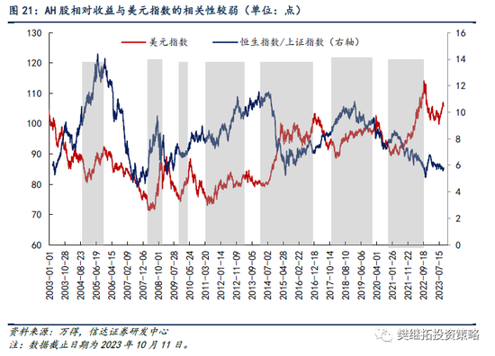 AH股相对收益与美元指数的相关性较弱。历史上美元指数走强时期,恒生指数相对于上证指数的超额收益走势没有明显规律。例如,2008年金融危机爆发后,投资者避险情绪上升,美国连续降息,美元指数走强。恒生指数绝对收益偏弱,但相对于上证指数的超额收益却较强。2014年半年-2015年Q1美元指数快速走强阶段,恒生指数虽然绝对收益上行,但主要受A股流动性牛市的影响,超额收益仍持续走弱。2016年之后,随着沪深股通的开通,A股投资者结构中外资占比不断提升,美元指数波动对AH股相对收益的影响也会变得更加复杂。