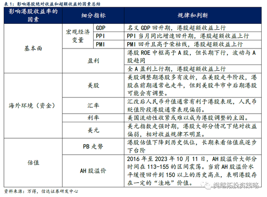 海外环境(资金):美股和汇率影响更大,利率影响弱。(1)港股行情特征与美股的联动性更强,美股调整期港股多有波折。主要原因可能与港股投资者结构中外资占比高、本质上是中国资产以美元计价的市场有一定关系。(2)考虑到历史上十年期美债和恒生指数正相关性反而更强,因此我们认为美国流动性收紧或难以成为港股调整的主因。(3)汇改后人民币升值通常有利于港股表现,人民币贬值阶段港股通常表现偏弱。(4)港股表现与美元指数负相关性比较明显。美元指数走强时期,港股大部分情况下绝对收益偏弱。AH股相对收益与美元指数的相关性较弱。