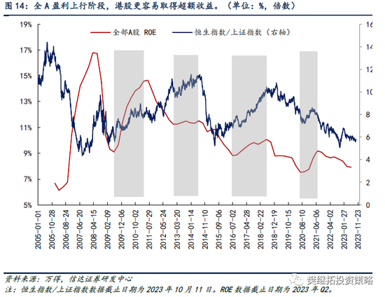 全A盈利上行阶段,港股更容易取得超额收益。2007年之后,在全A盈利上行阶段,港股超额收益均持续上行。尤其是2016年底沪深港通开通之后,在A股基本面改善阶段,港股的表现更强。例如2016年Q1-2018年Q2,恒生指数相对于上证指数的超额收益达到44%。2020年Q2-2021年Q2,虽然恒生指数区间超额收益不明显,但是在2020年Q4-2021年Q1盈利改善最快的时期,恒生指数仍然产生了16%的超额收益。在全A盈利下行期,港股相对于A股的表现并没有固定的规律。