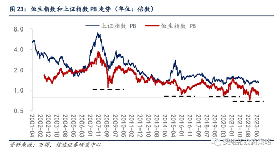 但长期看,港股估值底逐步下台阶。纵向对比来看,历史上港股四次阶段性估值触底,估值底均创历史新低。2008年10月恒生指数PB估值下滑到1.1倍;2016年1月恒生指数PB估值下滑到0.88倍;2020年3月恒生指数PB估值下滑到0.84倍、2022年10月恒生指数PB估值下滑到0.7倍。低估值是港股吸引全球配置型资金流入的优势之一,但需要注意的是,考虑到港股估值底逐步下台阶,低估值可能不是港股产生超额收益的充分条件。