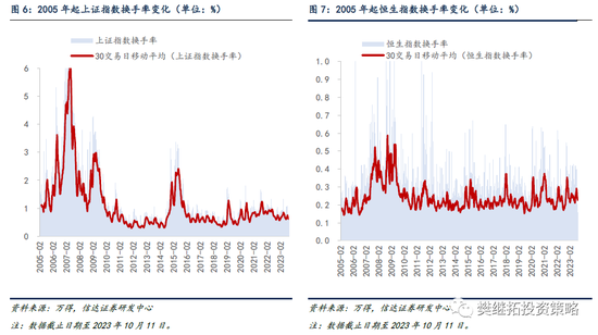 A股市场换手率整体高于港股,且波动较大。由于A股和港股投资者结构的差异,长期来看A股换手率中枢明显高于港股。2005年至2023年10月11日,恒生指数换手率中位值为0.2%,标准差0.1%,而上证指数换手率中位值0.75%,标准差1%。上证指数换手率中枢是恒生指数换手率中枢的3.5倍,且波动性明显更高。