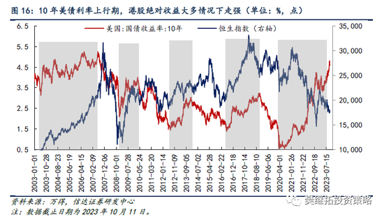 港股表现与美元指数负相关性比较明显。由于我国香港特别行政区采取一种特殊的汇率制度—联系汇率制度,港币和美元基本保持一个固定的汇率。美元指数的波动对于港股市场表现也有较为明显的影响。历史上在美元指数快速走强的时期,恒生指数大部分情况下均偏弱。只有2005年和2012年恒生指数在美元指数走强的时期绝对收益和相对于上证指数的超额收益都在上行。2005年的背景是中国经济处于长期上行通道,盈利高增长时期港股弹性高于A股。2012年的背景是欧债危机进入尾声,中国经济企稳预期开始增强,美联储于2012年9月宣布QE3,全球资金流入港股市场。